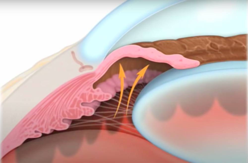 El humor acuoso se drena en su mayoría a nivel de la malla trabecular, una suerte de rejilla que se ubica en el espacio entre el iris y la córnea (ángulo irido-corneal).